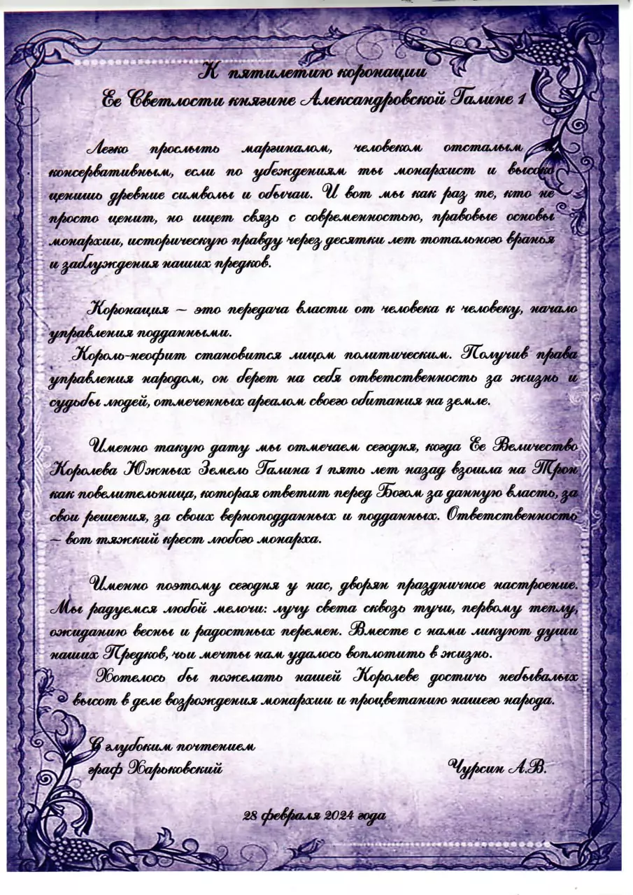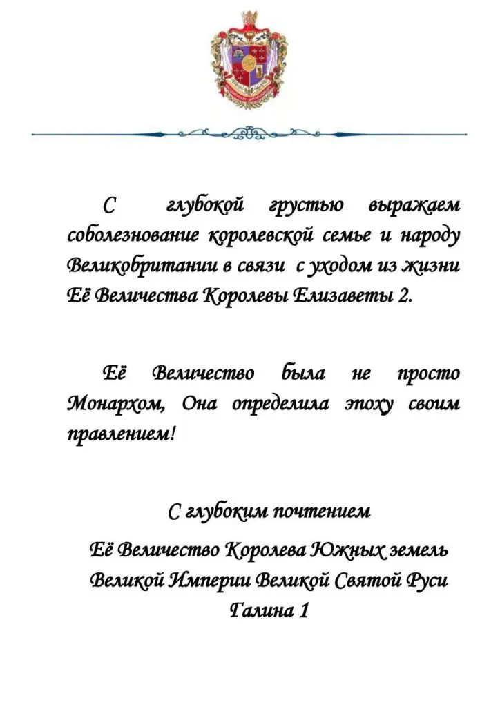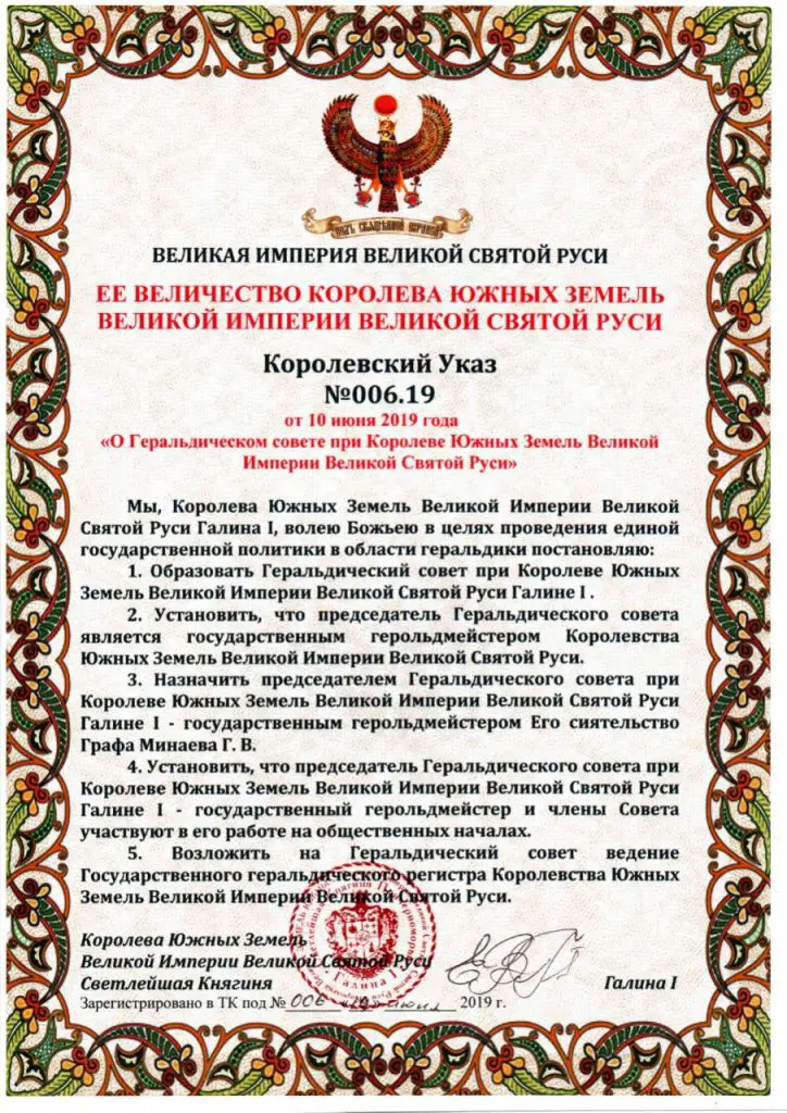 КОРОЛЕВА ЮЖНЫХ ЗЕМЕЛЬ ВЕЛИКОЙ ИМПЕРИИ ВЕЛИКОЙ СВЯТОЙ РУСИ