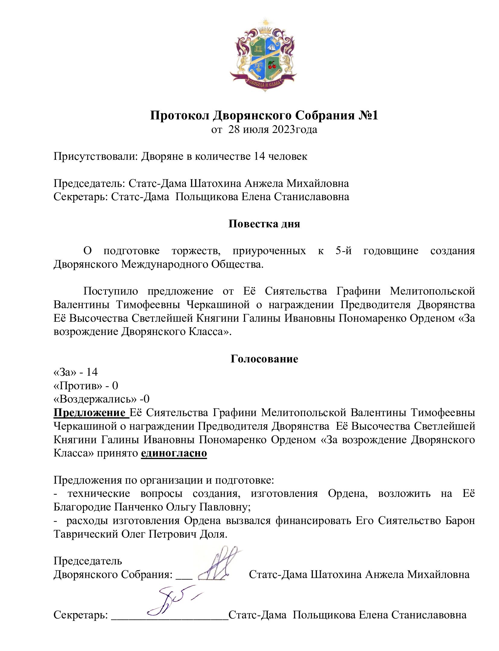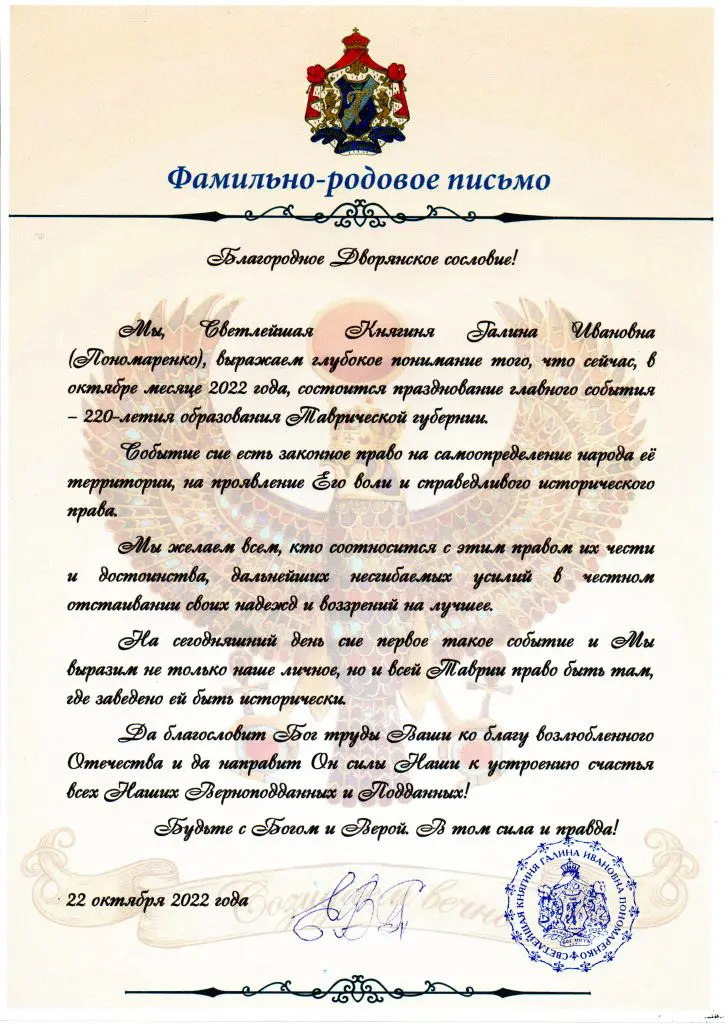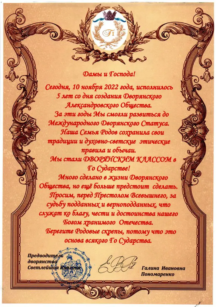 Предводитель Дворянства Её Высочество Светлейшая Княгиня Галина Ивановна Пономаренко