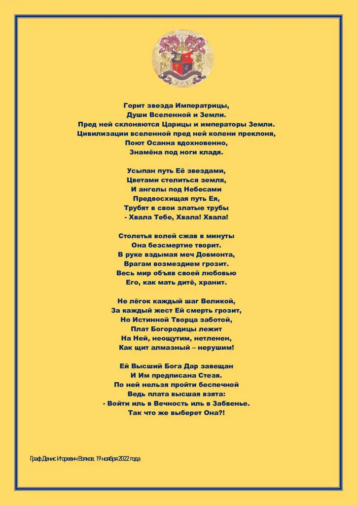 Благодарю Вас , подданные и верноподанные , за служение и поддержку во имя Родов и Отечества!