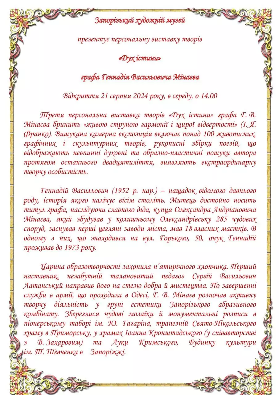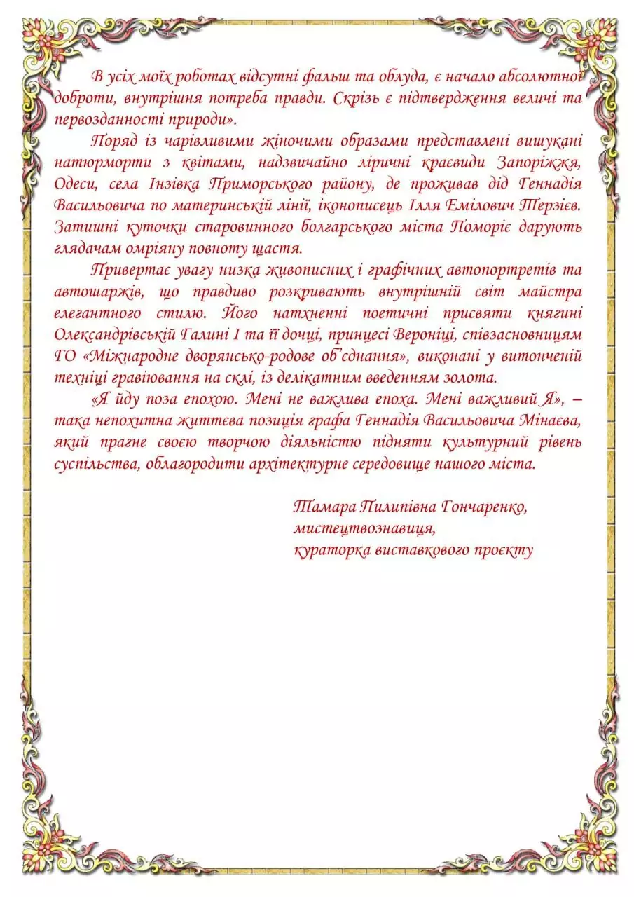 Ясновельможна Княгине Олександрівська Галино І Його Високодостойнрсте Князь Андрій Станіславович та Славна Княжна Вероніка! Щиросердно дякую за Ваш візит до Запоріжського художнього музею ! Дякую Господу за благословенний день 17 серпня 2024 року, наше знайомство в храмі мистецтв, удостоєному високих відзнак «Діловий імідж України. Економічний та інтелектуальний потенціал держави» (2005), «Мистецький Олімп України» (2006), «Україна в ІІІ тисячолітті. Традиції. Інновації. Інвестиції» (2007). Сьогодні на Мистецькому Олімпі яскравіє екстраординарна постать Графа Г. В. Мінаєва. Божого благословіння Вам і Вашій Родині!